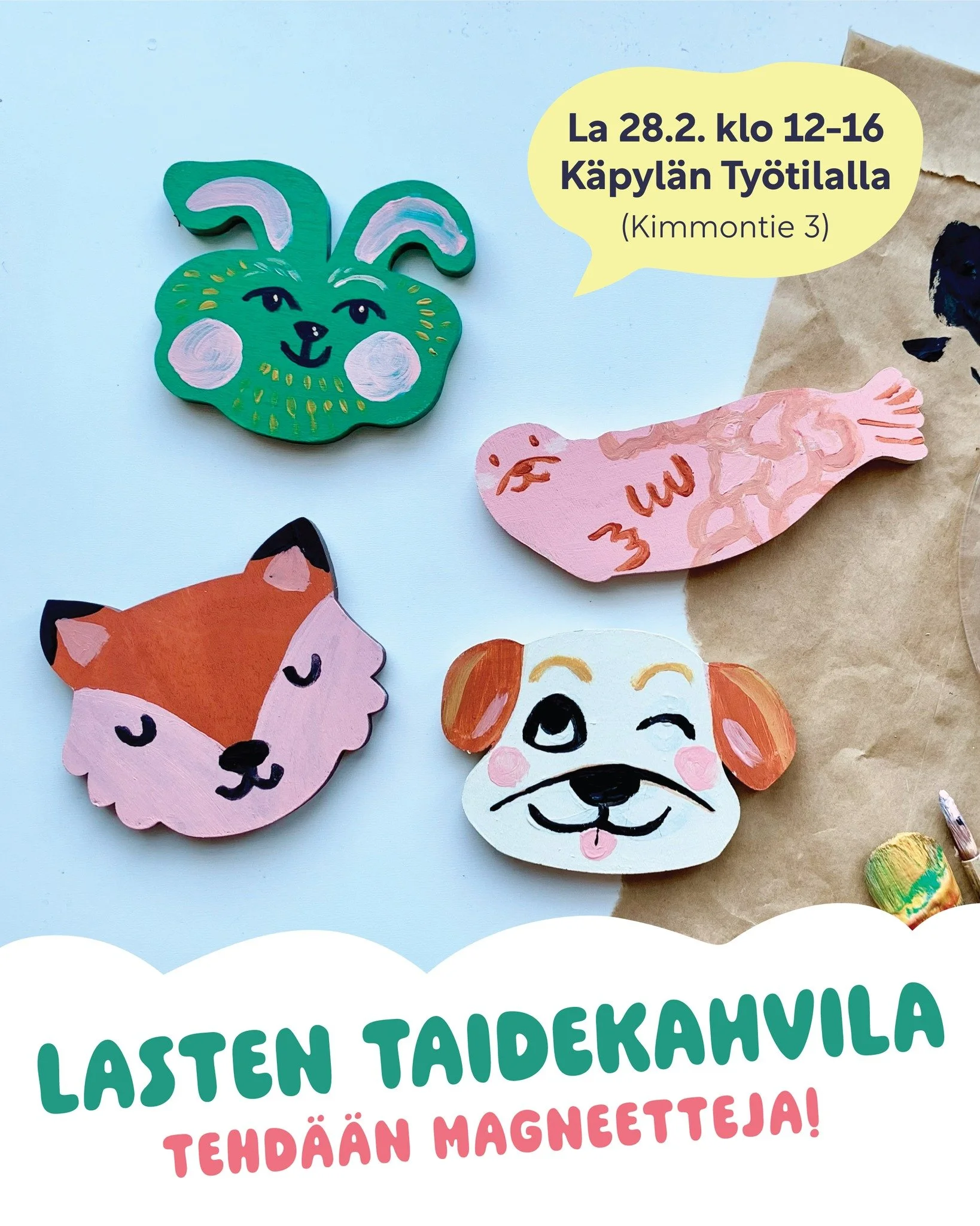 Työpajassa maalaamme värikkäitä eläinhahmoja vanerille ja teemme niistä magneetteja käpyläläisen kuvittajan Noora Ketolaisen opastuksella. Ei ennakkoilmoittautumista, tule milloin haluat!