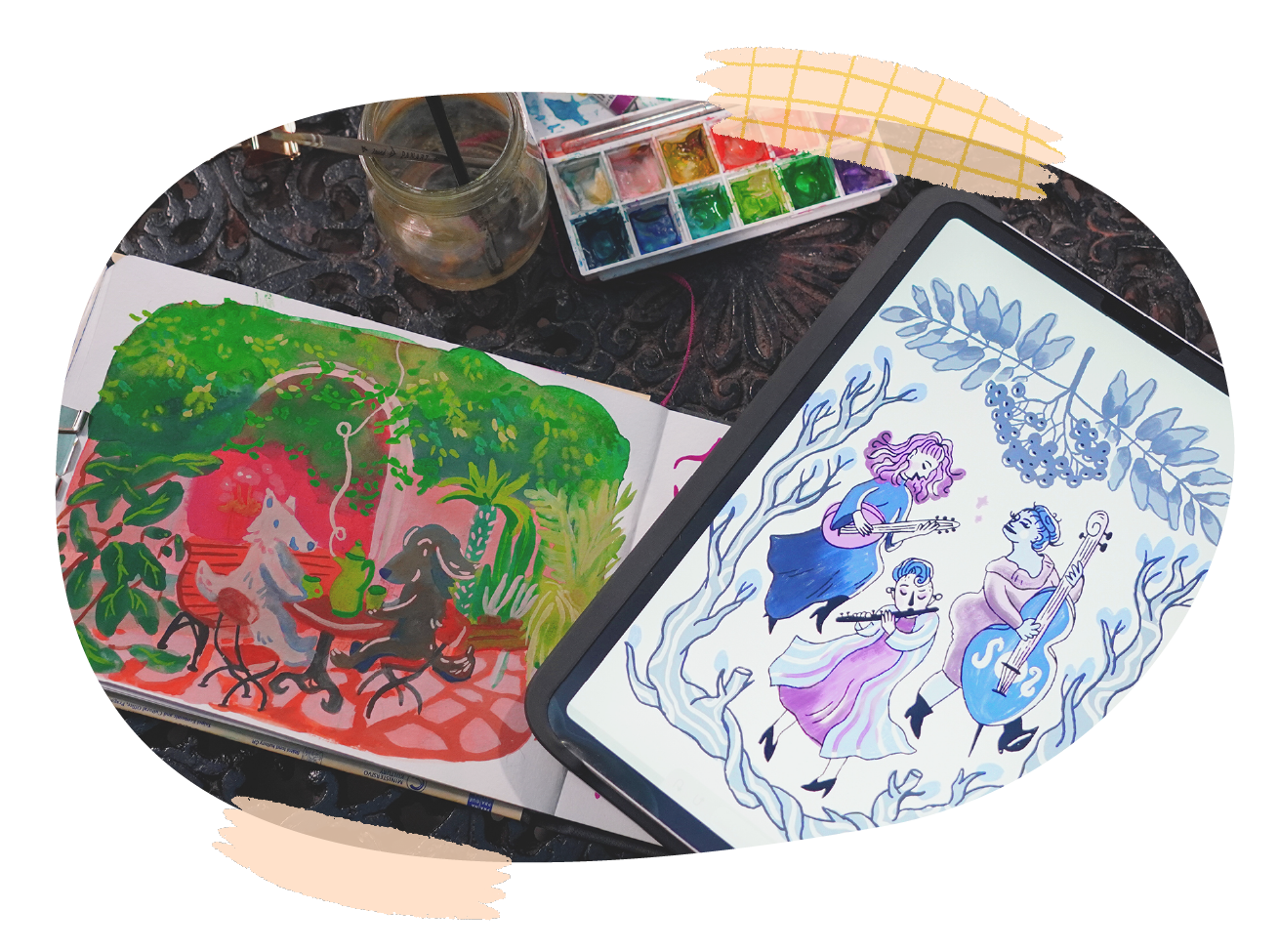 Moi! Olen Noora ja teen hymyt korviin nostattavia kuvituksia, sarjakuvia ja graafista suunnittelua.