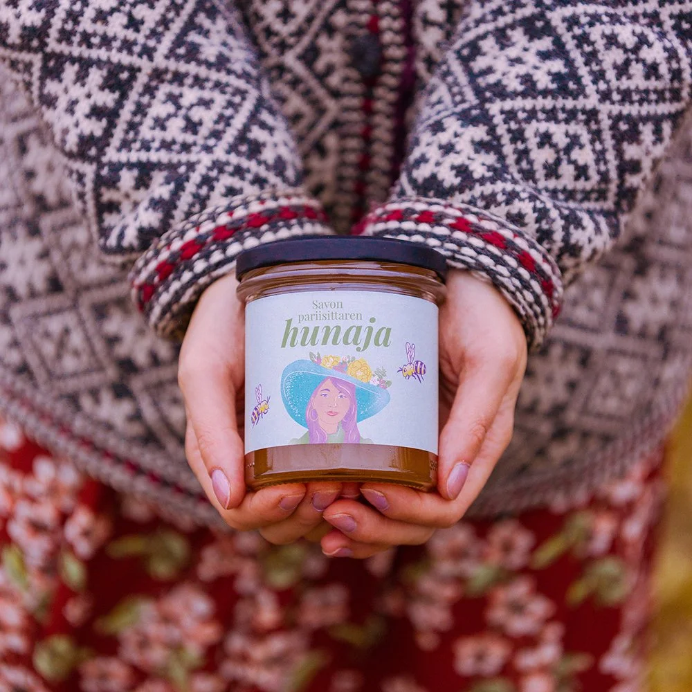 Sain luoda Savon pariisittaren hunajalle etiketin ainutlaatuiselle hunajalle. Etiketistä haluttiin muista hunajaetiketeistä erottuva, värikäs ja retrohenkinen. Mallina pariisittarena oli tietenkin itse mehiläistarhaaja, Savon pariisitar.
